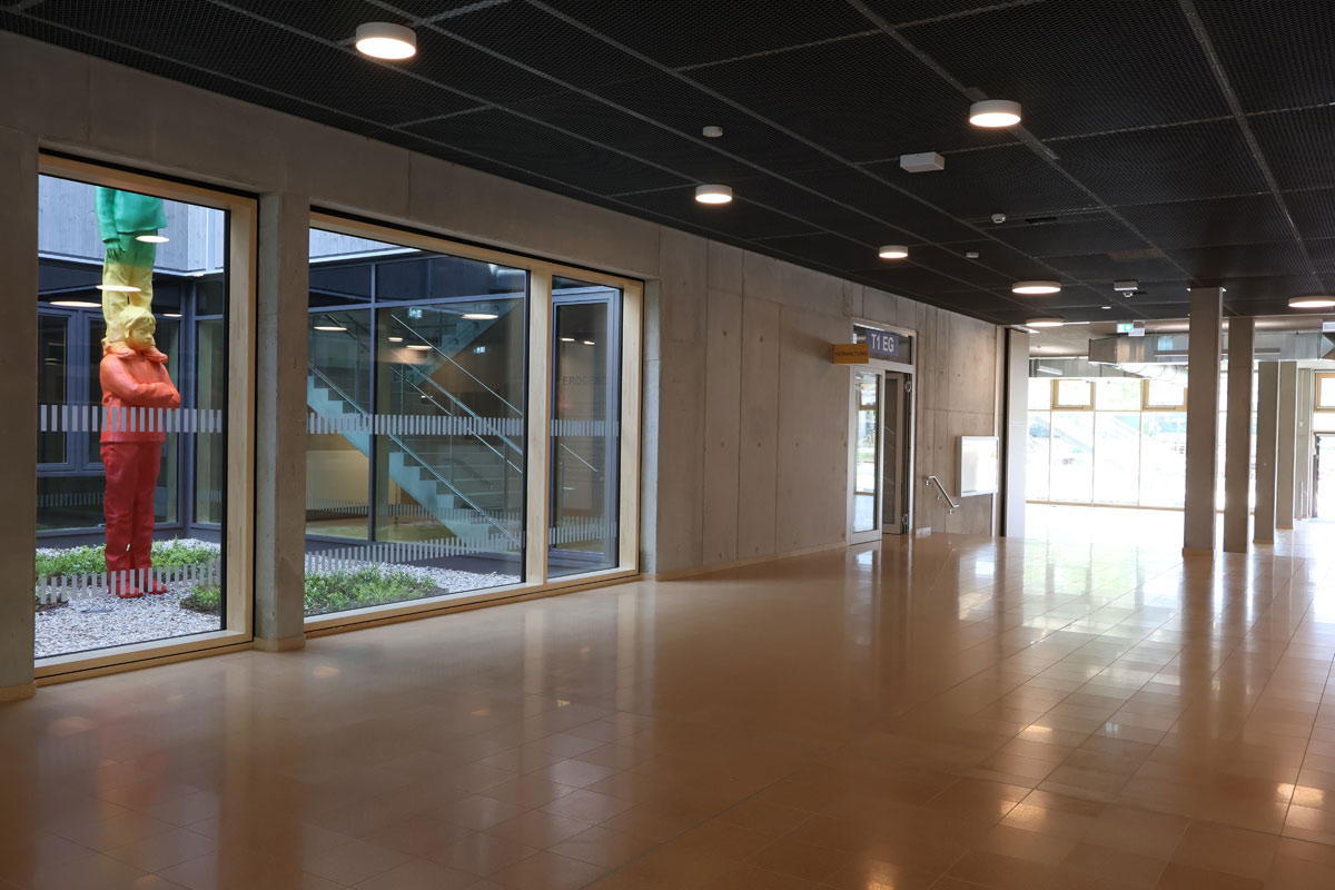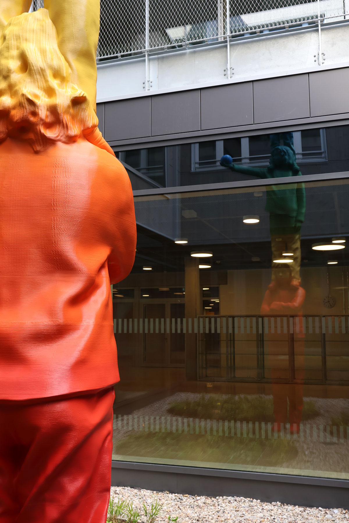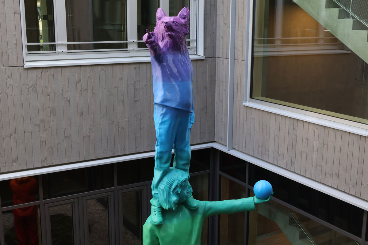 The artistic work “Lottchen³” is located in the middle of the atrium of the Erich Kästner Gymnasium. Standing on each other’s shoulders, the figures form a ladder to the northern opening of the school building on the 1st floor. The sculpture consists of three children who get smaller from bottom to top. The lowest figure, oversized at 3 meters, has its arms crossed. The middle one balances a (snow) ball on her hand and faces south. The top one faces the opening in the building and points north. At 1.7 meters, she is about the size of a high school student and is masked as an arctic fox. With the support of the two taller ones, the smallest one can reach the view.